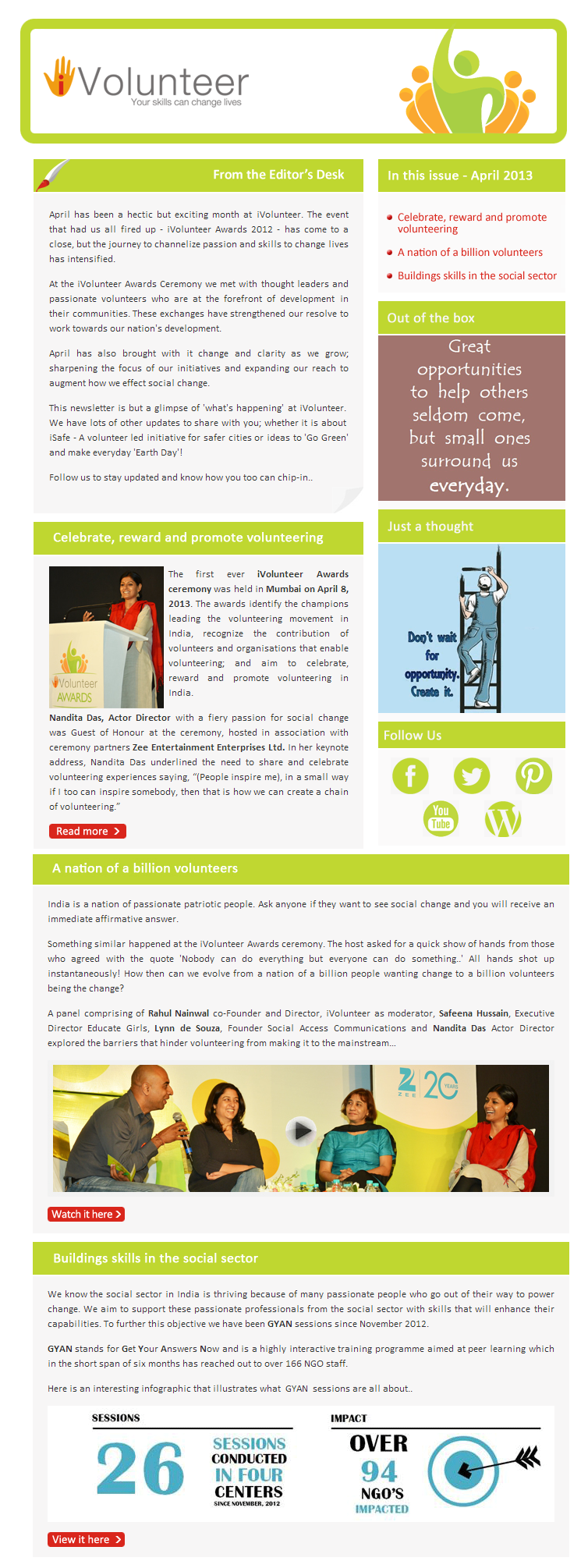 Categories Corporate Social Responsibility GYAN Impact Volunteering Newsletter Volunteering iVolunteer April 2013 Newsletter Post author By iVolunteer Post date July 8, 2013 No Comments on iVolunteer April 2013 Newsletter Go backYour message has been sent Name(required) Warning Email(required) Warning City(required) Warning I would like to receive iVolunteer's monthly newsletter Warning I want to volunteer. Tell me more about available opportunities Warning Feedback and Suggestions Warning Warning. Submit Δ Share this blog & help promote goodness Click to share on WhatsApp (Opens in new window) WhatsApp Click to share on Facebook (Opens in new window) Facebook Click to share on LinkedIn (Opens in new window) LinkedIn Click to share on X (Opens in new window) X Click to email a link to a friend (Opens in new window) Email Click to share on Telegram (Opens in new window) Telegram Click to share on Tumblr (Opens in new window) Tumblr Click to share on Pinterest (Opens in new window) Pinterest Like Loading... Related Tags GYAN, Impact, iVolunteer, iVolunteer Awards, Nandita Das, newsletter ← iVolunteer March 2013 Newsletter → iVolunteer May 2013 Newsletter Leave a comment Cancel reply Δ