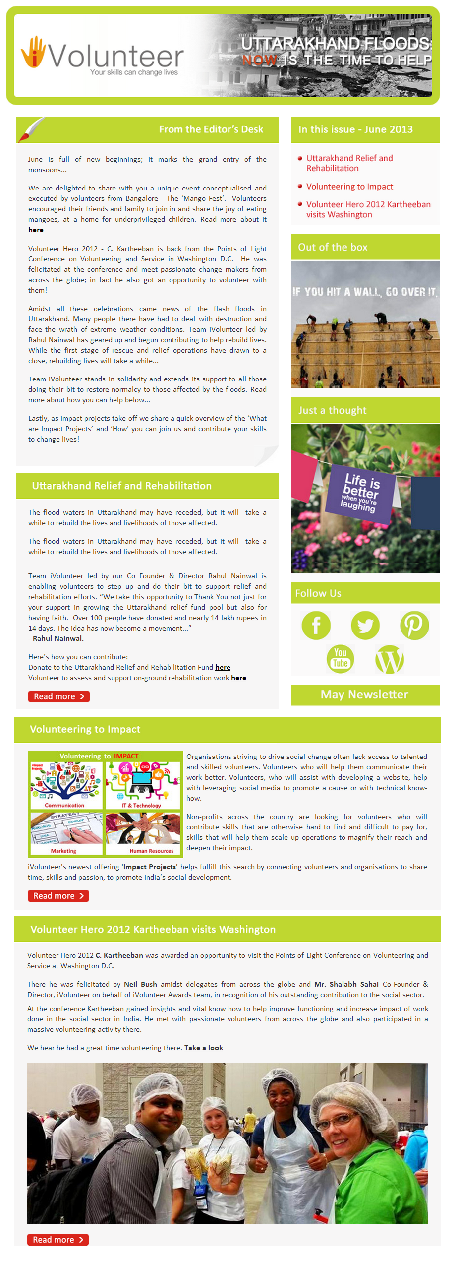 Categories Newsletter iVolunteer June 2013 Newsletter Post author By iVolunteer Post date July 30, 2013 No Comments on iVolunteer June 2013 Newsletter Go backYour message has been sent Name(required) Warning Email(required) Warning City(required) Warning I would like to receive iVolunteer's monthly newsletter Warning I want to volunteer. Tell me more about available opportunities Warning Feedback and Suggestions Warning Warning. Submit Δ Share this blog & help promote goodness Click to share on WhatsApp (Opens in new window) WhatsApp Click to share on Facebook (Opens in new window) Facebook Click to share on LinkedIn (Opens in new window) LinkedIn Click to share on X (Opens in new window) X Click to email a link to a friend (Opens in new window) Email Click to share on Telegram (Opens in new window) Telegram Click to share on Tumblr (Opens in new window) Tumblr Click to share on Pinterest (Opens in new window) Pinterest Like Loading... Related Tags Impact, iVolunteer, iVolunteer Awards, June, newsletter, Uttarakhand, Volunteer Hero, volunteering ← “Everyone’s culture is different. But the purpose is same”, says Volunteer Hero 2012 Kartheeban → GYAN Workshop on Social Media for Non-profits- Participant’s appreciation Leave a comment Cancel reply Δ