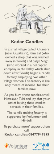 iVolunteer, is not a grassroots NGO. We don’t have any experience of working at the grassroots. We provide volunteers who work with the NGOs who then sometimes work on the ground. So all this work that we are doing is very new to us. At the moment we are working in 4 villages near Guptkashi and setting us small enterprises like candles making, soap, marmalade, incense sticks etc. We make a small grant to the entrepreneurs, give them trainings and help them make linkages with the market.