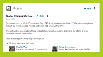 - Space has also been provided to add collaborators to your project. Here you may tag a fellow volunteer or project team member if they have LinkedIn profiles or simply type in their names if they do not have profiles.