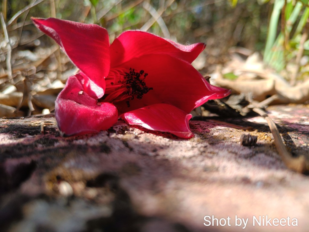A straight, high, mature figure with a lot of small red dotted crowns on its head was shining in the sun. Guess who it was?  It was a tree called Shalmali! What a lovely name! Just like it’s aura! Flooded with dark pink flowers giving a crown vibe without single leaves on the stem.