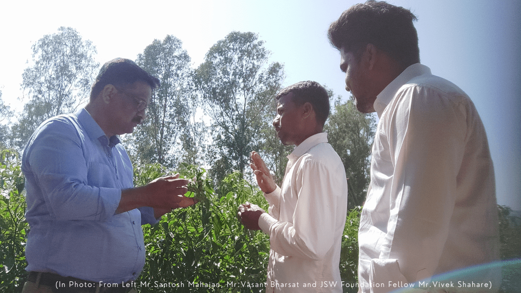 But this story is not limited to only Vasant, 50 farmers, and the families impacted through this program and changed their lives. All the farmers who were engaged in this program, are sustaining this program of Chili Production with their capacities and earning a minimum of 3 – 5 Lakh rupees after selling. Now farmers follow all the required tasks like buying plants for cultivation, planning the plants and beds covered with mulching paper, providing water through drip irrigation, planting the plants at 2 feet distance, sparing fertilizers or pesticides as required, harvesting chilis, segregation of chillis, Linkaging with the market and selling the chillis. Farmers also learned to save money utilize money for their living and invest in farm activities for growth as well as improving farm activities. Throughout the journey, farmers have gone through various challenges including the unavailability of requisite investment, low market rates, transport facilities, unconditional weather or climatic effects, diseases on plants, etc. Because of the collaborative effect of farmers and the JSW Foundation, all these challenges were mitigated or managed effectively and after 3 years of support given by the JSW Foundation, now farmers are cultivating chili on their own.