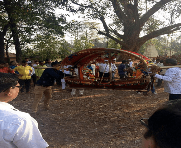 Along the Konkan Coast, it is believed that with Shimga, God arrives at one’s home to partake in the festivities. Villagers clean their houses and decorate it with paintings, flowers and make beautiful rangoli on the entrance. Later, they shoulder idols of the deities to their houses in palkhis and pray for well-being and prosperity. A colorful procession of people singing and dancing on traditional songs alongside the palkhis with staunch devotion marks the unique celebration. The 5th day of Shimga, also known as Rang Panchami, is reserved for playing Holi with neighbors, as layers of multiple colors transcend societal differences. People of all ages come together to smear each other with organic colors, made from herbal ingredients like neem, kumkum, and haldi. Konkani Holi practices also ensure that the environment is not harmed by harsh chemicals that are present in regular colors. A colorful procession bearing deities on floats starts from the temples in the evening. The parade winds through the streets of Panjim to the sound of drums, flutes and folk songs. It comes to a halt only in the early hours of the morning.