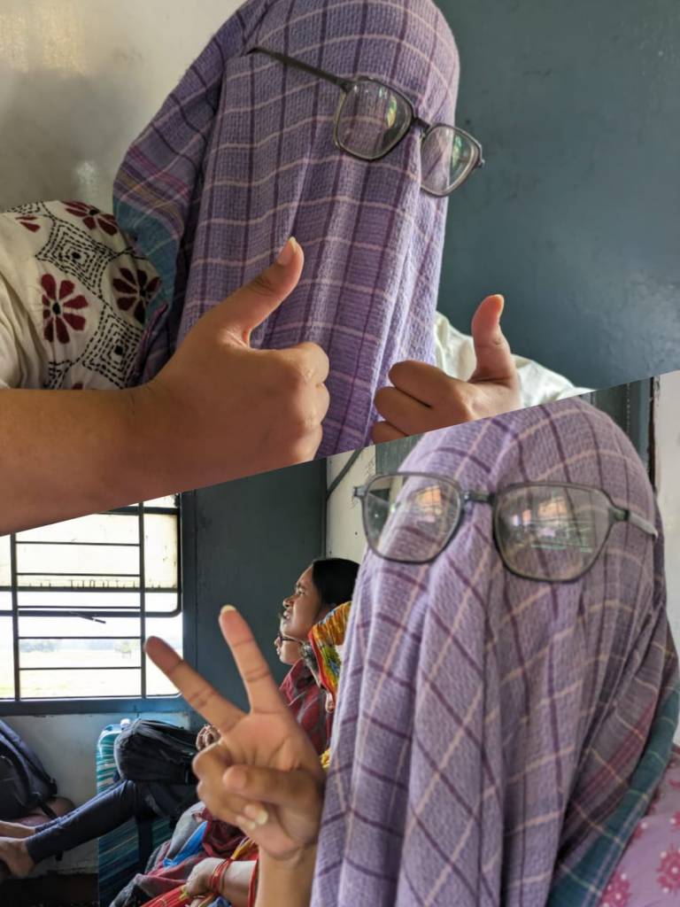 Nights pass easily while sleeping, but now it was daytime, and we had no idea how to kill time. Fortunately, we had pre-downloaded movies, series, books, and music on our devices since getting a network connection on the train is quite challenging. We started engaging in our respective interests to pass the time. However, everyone was a bit frustrated. Someone nearby fell asleep in their seat and started snoring so loudly that it was impossible to concentrate on anything else. Then, a child began crying, and a group of people nearby were either listening to music at full volume or scrolling through loud reels on their phones. The noise was overwhelming, and we couldn’t figure out what to do, nor could we ask anyone to be quiet. Amid our conversations, the chai vendor came through, shouting “Chai.. chai.. chai.. ” and we were compelled to buy a cup of tea. I was determined not to get bored under any circumstances, so I opened my bag of tricks and decided to do something with Vibha’s beautiful long hair. I started styling her hair, and you can see the results in the photo.