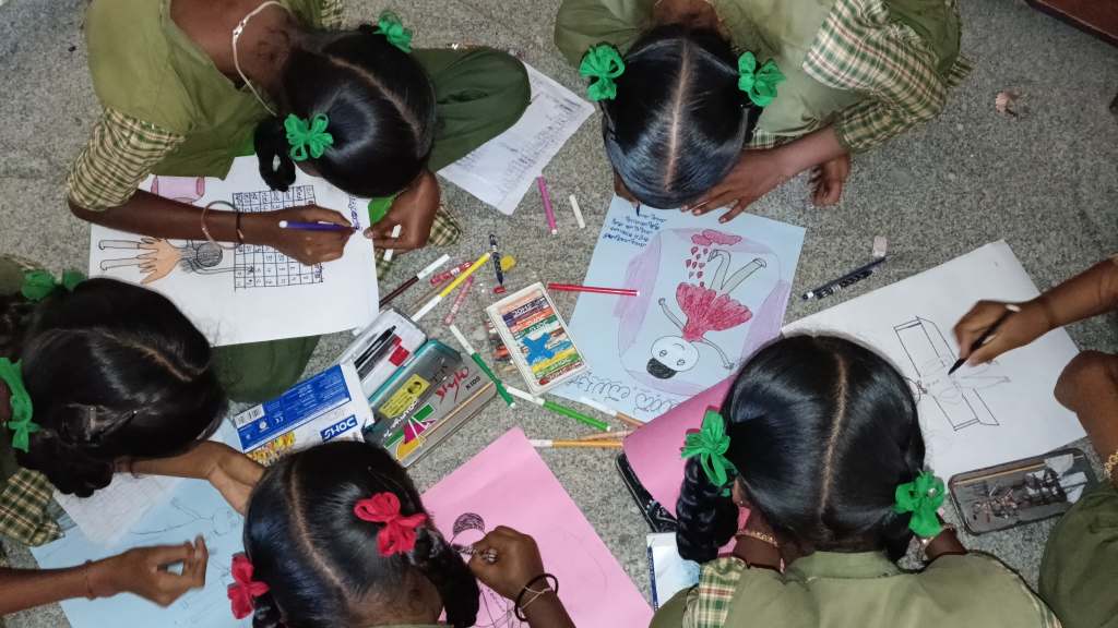 Let me introduce myself. I am Valli Padma, a JSW Foundation Fellow, who has organised poster-making competitions for 8th and 9th grade students across 10 schools, with approximately 500 participants. Over the past 6 months, these students have been attending training sessions on menstrual health and hygiene. The goal of the competition is to gauge the students’ understanding of menstruation and evaluate how openly they are able to express what they’ve learned during the sessions.