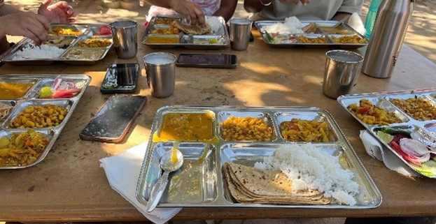 Among the many visitors at Khamir, we noticed designers, students learning various crafts, and art enthusiasts lost in admiration. The scorching sun bore down on us as we soaked in every sight, sound, and story. As the day drew to a close, we were treated to a sumptuous traditional meal prepared by Manish Bhai and his culinary team, served with warmth by Danji Bhai. The flavors of Kutch, rich and authentic, left an unforgettable imprint on our taste buds.