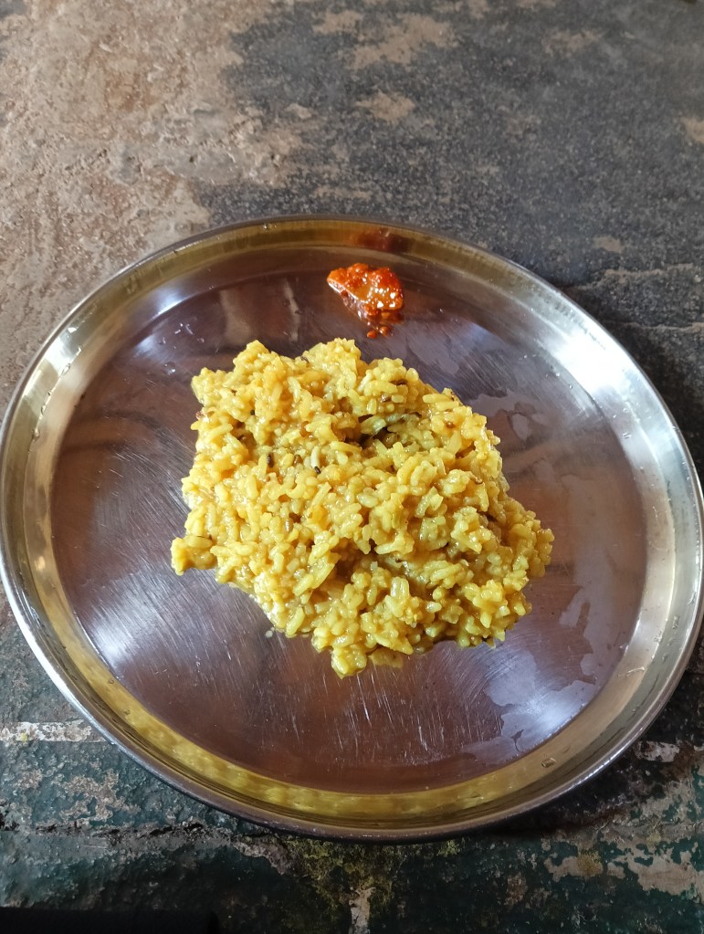 मेरे ना कहने पर उन्होंने मुझे खिचड़ी खाने के लिए आमंत्रित किया। गांव के स्कूल में बच्चों के साथ जमीन पर बैठकर खाना खाना मुझे अपने बचपन की याद दिला गया। जैसे ही खिचड़ी की थाली सामने आई, बच्चों ने खाने से पहले मंत्र गाने शुरू किए। वे किसानों और भगवान को धन्यवाद दे रहे थे। यह मेरे लिए बिल्कुल नया था। मैंने भी कभी अपने स्कूल में ऐसा गाया नही था। अक्सर हम खाना खाते समय इन चीजों पर ध्यान नहीं देते, लेकिन यहां हर निवाले के पीछे एक कृतज्ञता छिपी थी।