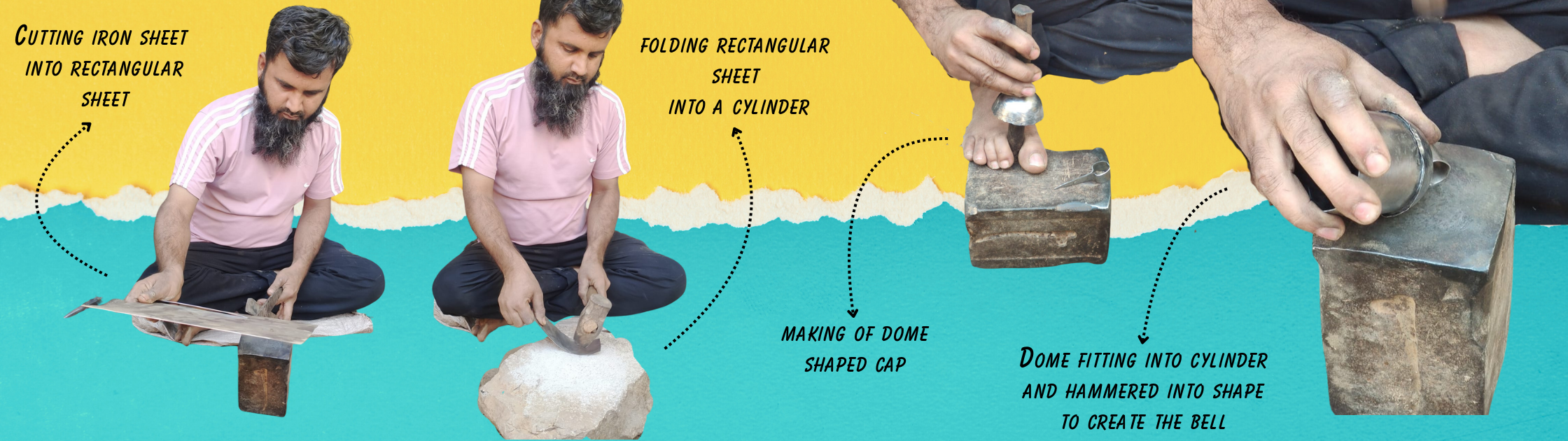 While the men of the house, who are blacksmiths, work with iron pieces to make the bells, the ladies of the house are responsible for polishing the bells using a mixture of mud and copper powder. First, Yakub Bhai takes a rectangular strip of iron and manually hammers it into shape, folding it into a cylinder and securing the open ends. Next, he cuts another strip of iron into a circle that is larger than the base of the cylindrical piece he created earlier. This circular strip is then continuously hammered and shaped into a dome, resembling an inverted bowl.