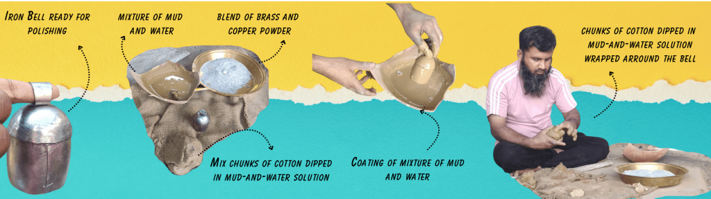 This process involves several important steps to achieve a polished finish. First, they will dip us in a mixture of mud and water, after which a blend of brass and copper powder is applied to our surface. This metallic powder adheres to the bell, which is already coated with the thick mud-and-water solution. Next, chunks of cotton that have also been dipped in the mud-and-water solution are flattened like cakes and wrapped around us. This work is primarily carried out by women at home. After the wrapping is complete, we get baked in a traditional country oven powered by wood or coal. The baking duration varies depending on the size of the bell, typically ranging from 30 minutes to about 2 hours.