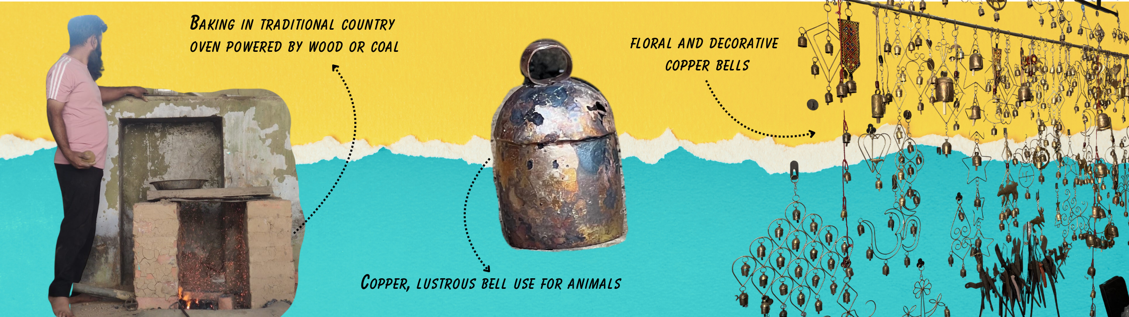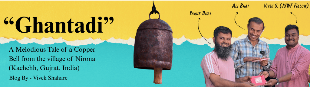 ‘Ali Bhai’, the elder brother of ‘Yakub Bhai’, owns a shop called ‘Copper Bell Art’ in our village, Nirona. In his shop, he showcases us so that those who love us can take us home or give us a space to sing our melodious tunes. He also takes us to various exhibitions all over the country. The craft of making us is over a thousand years old and is believed to have originated in Sindh, now in Pakistan. It was popular among nomadic pastoral tribes who adorned their cattle with bells of distinctive sounds, helping to locate wandering animals. The bell makers, from the Lohar caste in Kutch, have a lineage tied to this craft. In India, communities have a strong bond with animals, celebrating them through festivals like Govardhan Puja and cattle fairs. Over time, as these tribes settled in the Banni region and adopted a more sustainable lifestyle, our use has evolved from practical cattle alerts to contemporary decorative items.