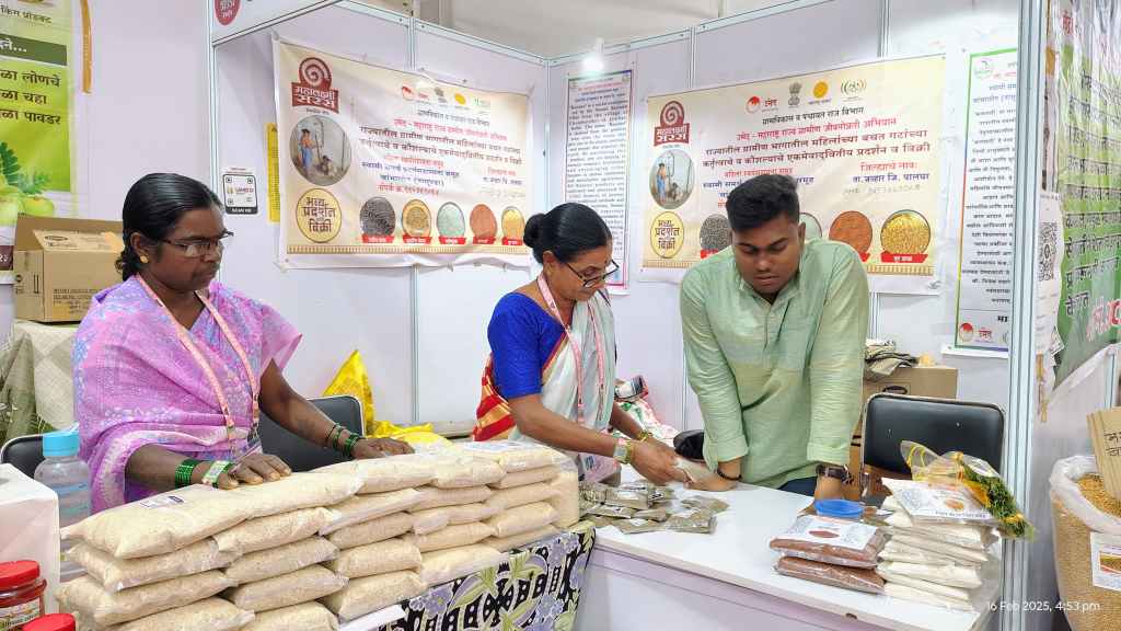 Building on this success, UMED Palghar selected our SHG for participation in the state-level exhibition “Mahalaxmi SARAS 2025” held in Mumbai. This exhibition helped them generate nearly INR 50,000 within five days, providing income to six women. This grand event allowed them to represent “KANSARI” on a much larger platform, where Bebi Tai and another member had the chance to stay at a hotel in Mumbai for the first time over seven exciting days. This experience not only empowered them but also left them feeling motivated and confident in their entrepreneurial journey, solidifying their commitment to fostering further growth and opportunities within their community. During the exhibition, Bebi Tai, along with other members of the SHG, actively engaged in exploring the event and underwent a transformative experience that enhanced their leadership skills. They not only gained confidence in presenting their products but also created valuable opportunities for other farmers in the village, enabling them to sell their harvest at fair prices.