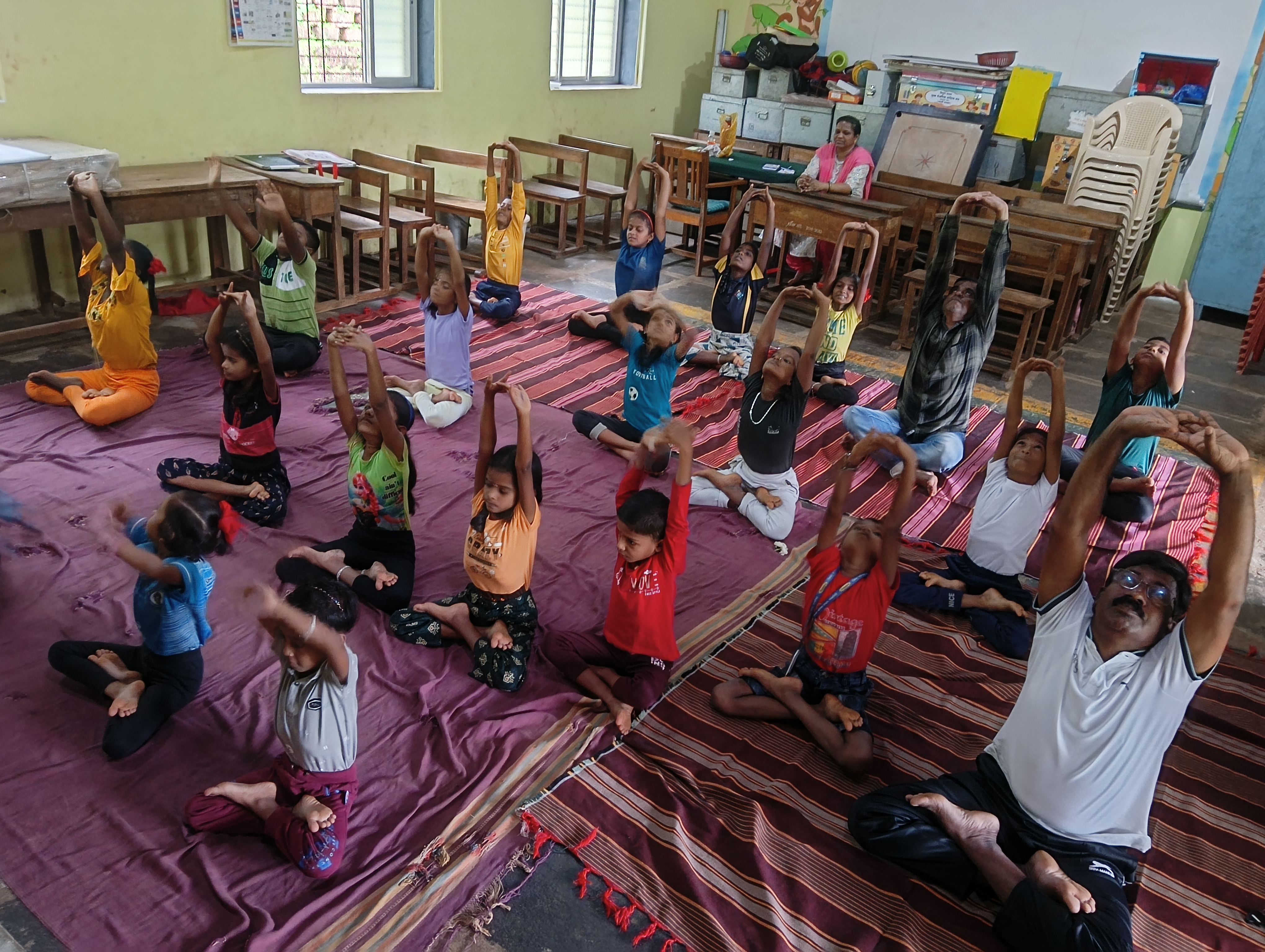 I doesn’t matter where you are -home- school – or village -Yoga is for everyone . You don’t need fancy clothes , a perfect mat ,or a yoga teacher … Just sit down close your eyes breathe that’s the beginning………….
