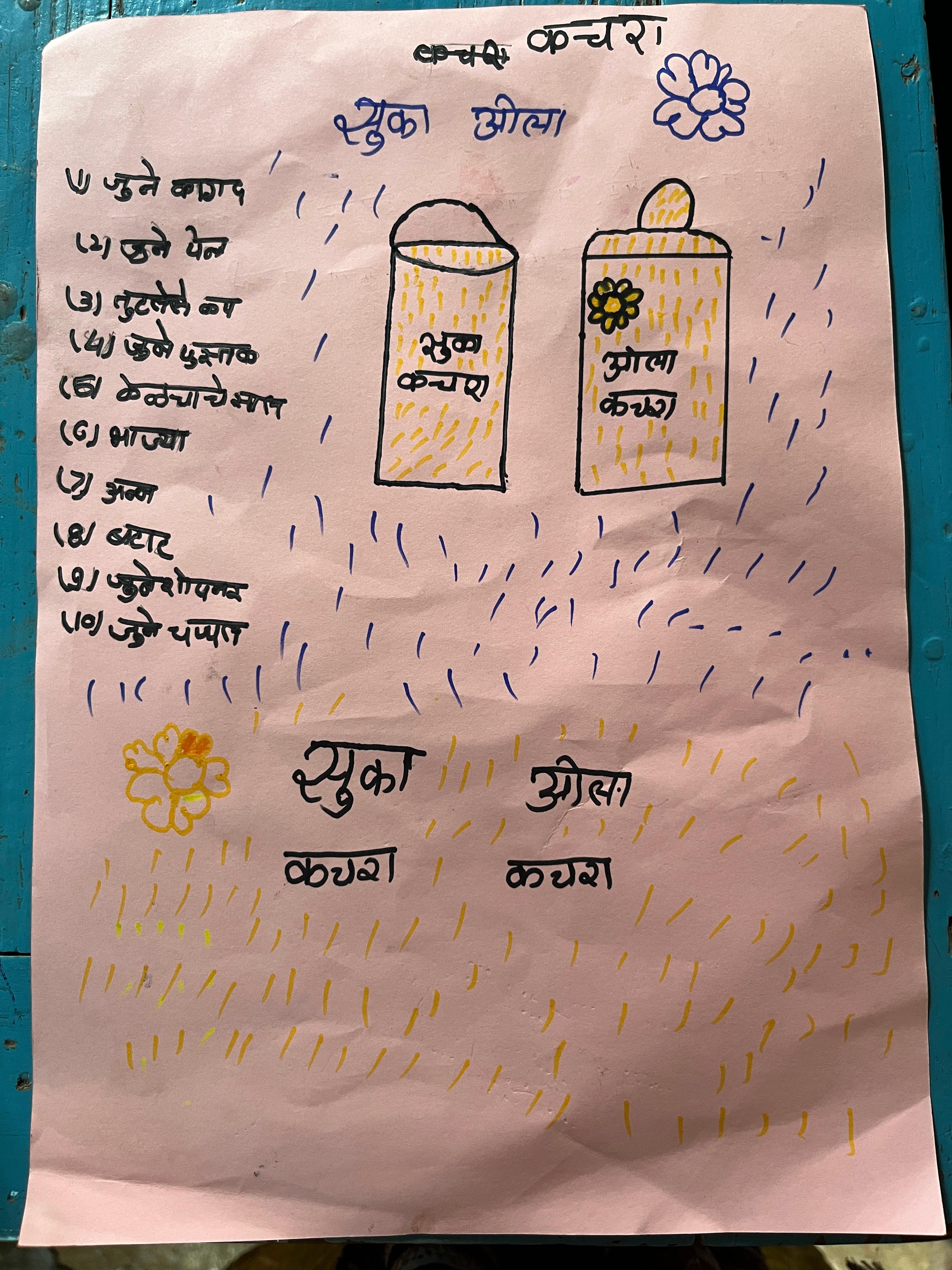 Using simple, local examples, like the difference between vegetable peels and a used chips packet we can teach kids the basics of wet (biodegradable) and dry (non-biodegradable) waste. Interactive charts, local case studies, and stories from their own villages make learning relatable. Also, it is imperative to tell children the ‘WHY?’ behind everything, so that what they are able to retain what they learn in the classroom. For example, the dried garden leaves does not fall under the dry waste category. But why?