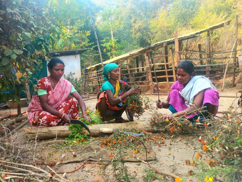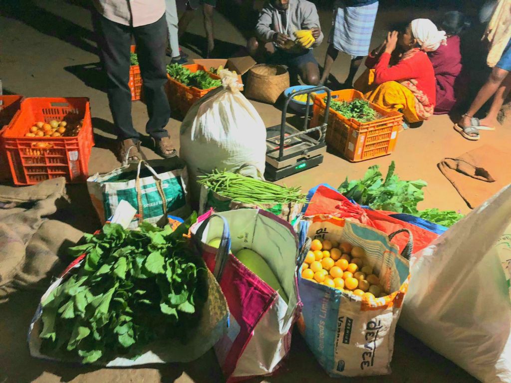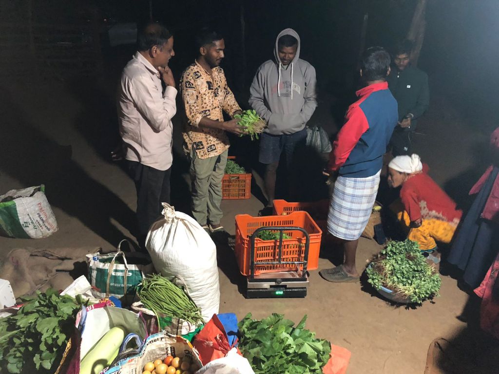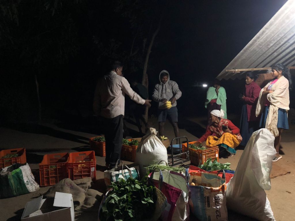That evening—around seven-thirty—I witnessed the immense joy of receiving cash in hand just minutes after harvesting crops. Beside Raju Netam’s field in Kutulnar, dew shimmered on a lemon tree. Pulling aside the bamboo fencing, Mukesh Netam, Shyamabati Netam, Mukesh Wam, Sadhuram Kunjam, and others stepped inside. The fragrance of fresh produce mixed with waves of laughter, creating a small marketplace. Someone brought baskets filled with tree-ripened bright yellow bananas. Someone carried beans in jute bags; others brought carrots, tomatoes, coriander leaves, red spinach—so much more.