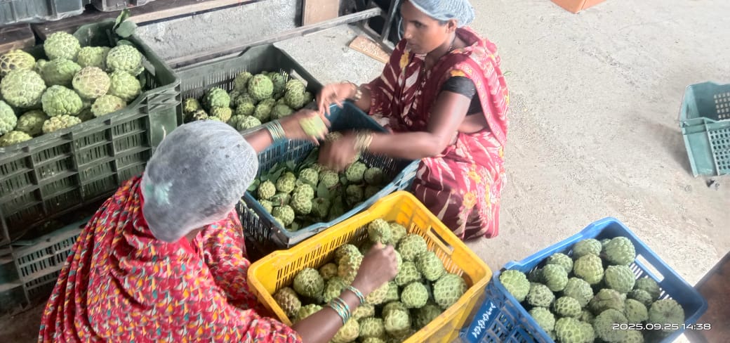 Today I’ll be writing about what a day in the custard apple processing unit with 12 women looks like. In brief, It was loaded with heavy work of lifting weights, skilled work of processing, it was full of strategic moves like what work to be given to whom and creating a space to enjoy through music, dance and entertainment. As I was also supervising processing for the first time, my everyday was an experiment for the better and the good part is the previous day mistake is not repeated, and this how those 30 days of processing gave women the work they needed and me the strength to supervise the hectic work.