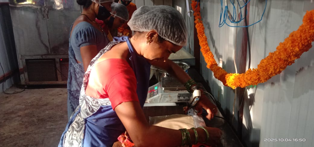 Before breaking for lunch, the women clean up the space, discard the waste peels into collection pits, broom up the floor, and clean up the utensils for the next round of pulp extraction. They break for lunch around 1’30, for some 30 minutes and join the unit back around 2. Another round of processing begins. The pulp of 3rd batch goes for quality check and packaging and storage and scooper team begin scooping of left over fruits and two more rounds of pulp is extracted. Around 4’30 the last batch of scooped material goes for pulping and scooper team finishes their work. Now they clean the space, dispose of the peel waste in pits, wash the ustensils, broom and mop the floor. The team of 4 is still engaged in quality check of pulp, packaging and storage of pulp. By the time space is cleaned and arranged for next day, the packaging team also finish their work, they clean the machinary and the space and keep the pulp for hardening. By 5’30, all work is closed and we cheer themselves for the work they have done. Though the work is exhausting but at the end of the days seeing packets of frozen pulp satisfies the most.