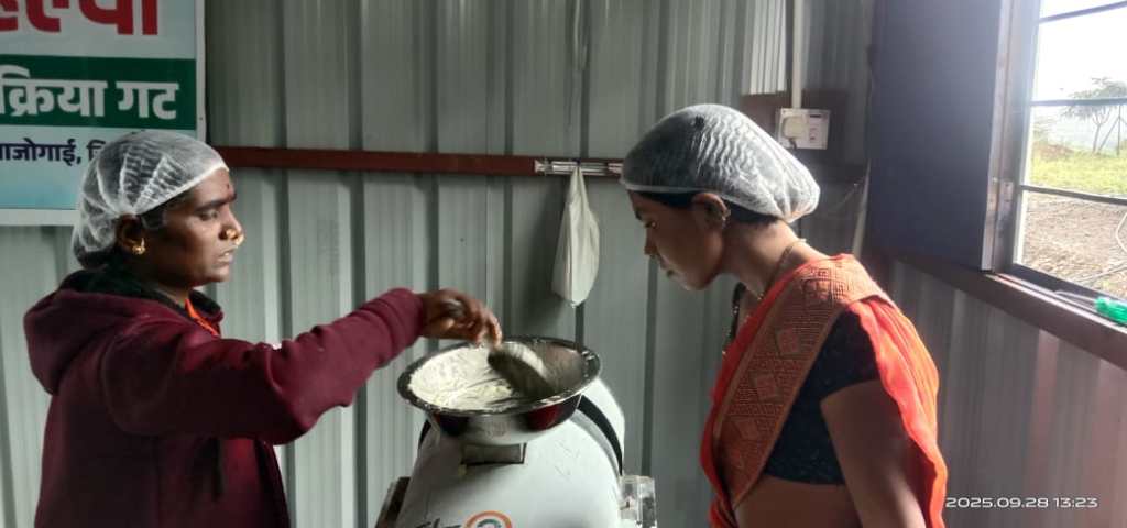 The next phase begins at 10’30 when everything is arranged, all of them sit for scooping custard apples, in a span of 40 minutes each of the women collects approximately around 7 kgs of custard apple flesh and seeds and after this 4 women takes the charge of further process of quality check, pulp extraction, packaging and storage and rest 6 continue scooping custard apples. Here the team of ten gets divided into a team of two, with 4 specialised and skilled in processing and packaging and 6 members in scooping and waste management. This division is not strict, women exchange roles if it gets monotonous for them, they support the team when it’s understaffed and have a larger quantum of work. All the women of Ahilya Gath holds an experience of working in every part of processing.