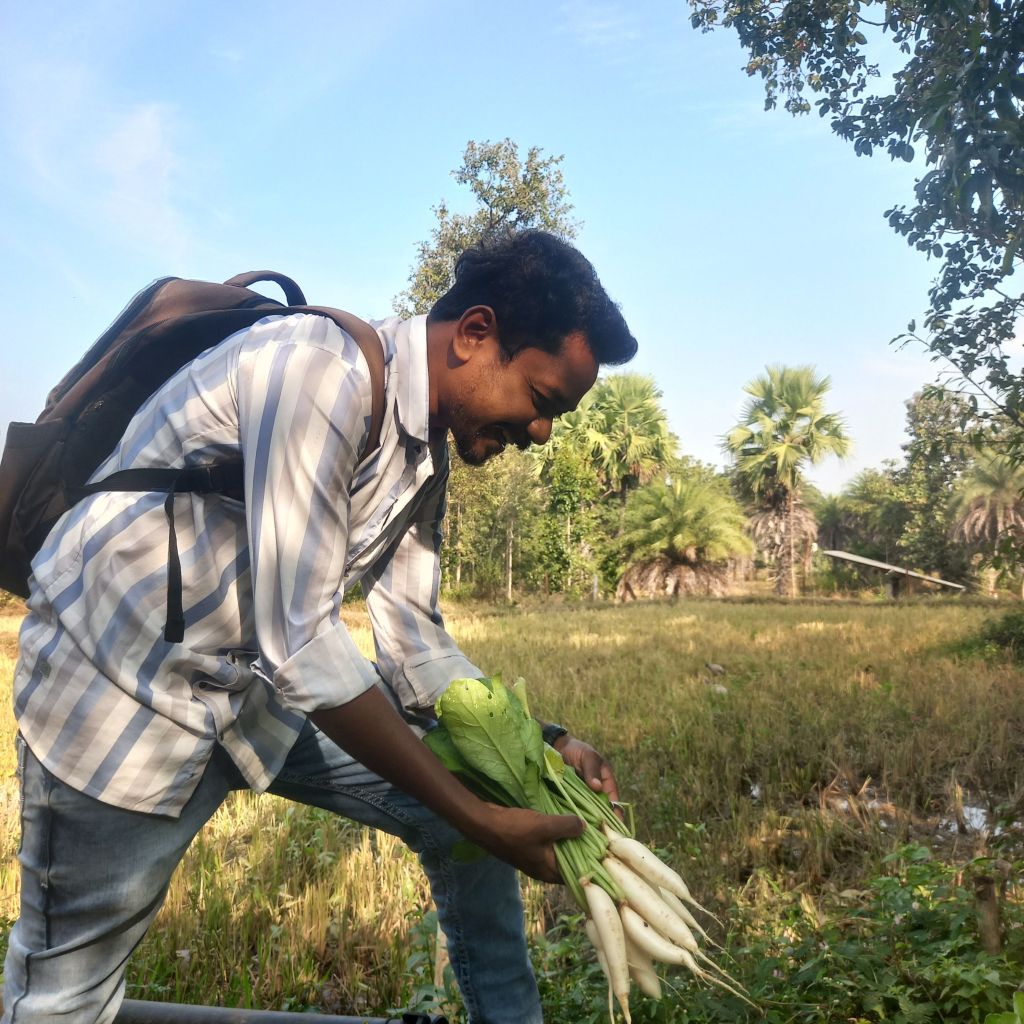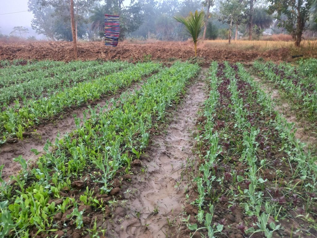 Take an example- In the mont of October we sowed seeds in the field of Sonaram Kunjam. In a same time he sowed Radish(1st layer-root crops) Spinach(2nd layer-close to ground), Okra(little above the ground) together in a same bed. After 20 days all seeds grown to plants we sowed the seeds of peas on the same bed. Maintain the distance from okra plants. After 10 to 15 days the peas seed grown to a healthy plant and we harvested Spinach.
