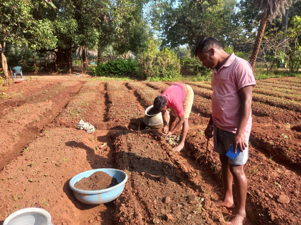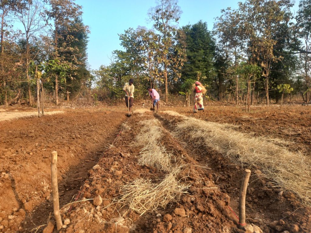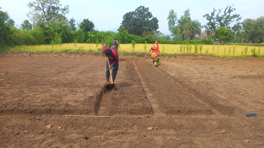 Raised beds: We need to prepare raised beds of a fixed size. In villages like Binjam, Kutulnar, Siyanar and nearby areas, we have made beds that are 2 to 2.5 feet wide. The width of the beds depends on the irrigation system, soil type, and the farmer’s preference.