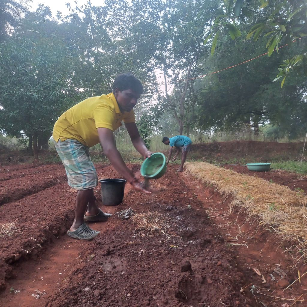 Soil treatment: Even after preparing the beds, the soil is treated with Trichoderma. Along with that, we use Jeevamrit. This helps bring life back into the soil and increases microbial activity. It also helps keep viruses and harmful pathogens away.