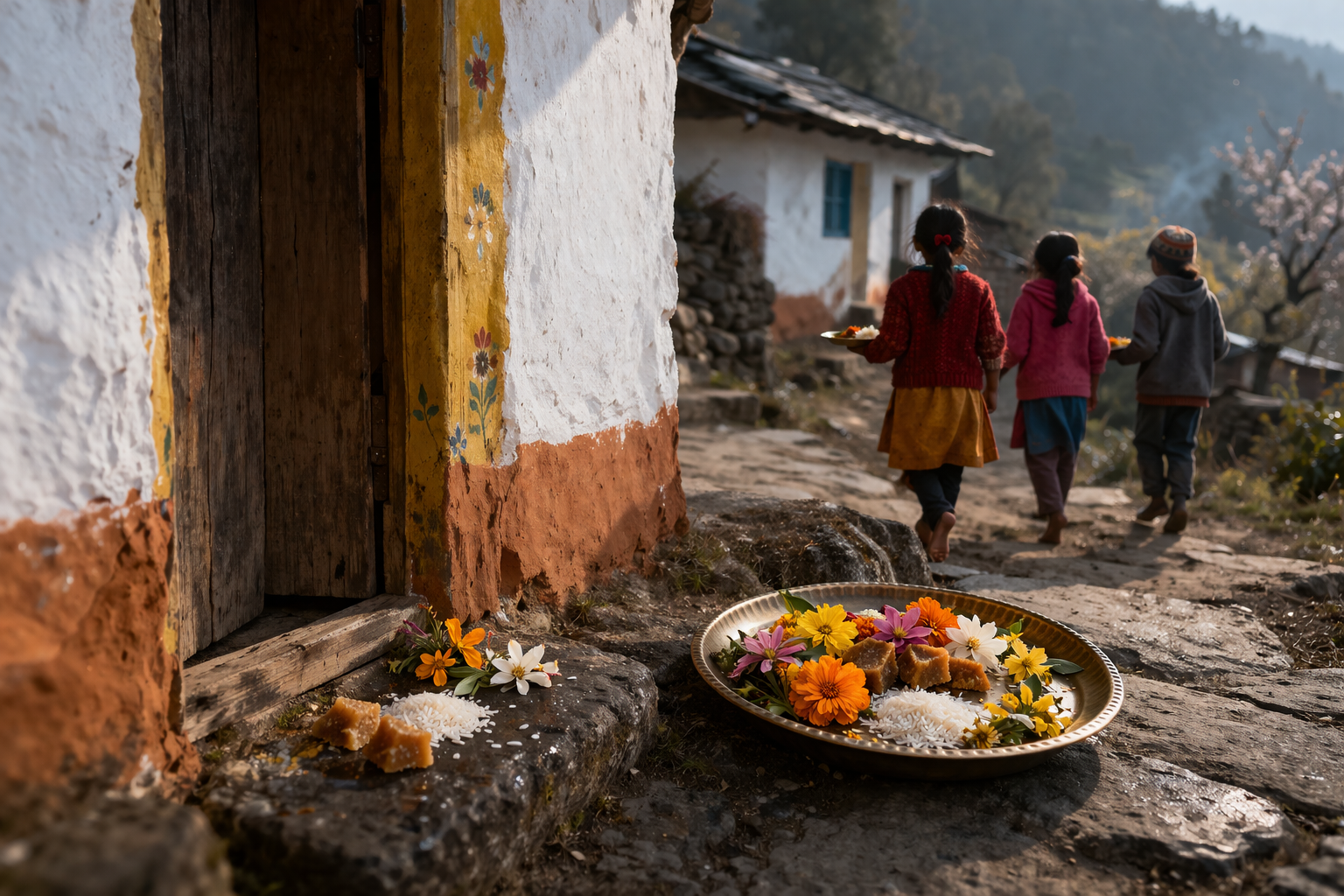 On the day of Phool Dei, children of the village, though elderly, may also participate and go from door to door, carrying plates filled with freshly bloomed flowers, along with rice and jaggery. At each household, they place flowers, rice, and jaggery at the entrance and sing a traditional song-