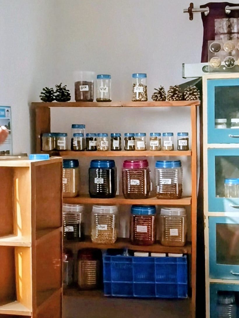 A typical community seed bank operates through collective participation. Let me elaborate; Farmers contribute seeds from their harvests to the seed bank by identifying and collecting seeds of traditional or locally important crop varieties. These seeds may come from their own farms or from neighbouring villages. The seeds are then carefully cleaned, dried, and sorted to remove damaged or unhealthy grains. It must be noted that proper storage is essential to maintain seed viability. Seeds are often stored in airtight containers, earthen pots, or specially designed storage bins that protect them from moisture, pests, and fungal growth. In some cases, simple traditional methods such as mixing seeds with ash or neem leaves are used to increase their shelf life – although that is not done at INHERE, as I’m told.
